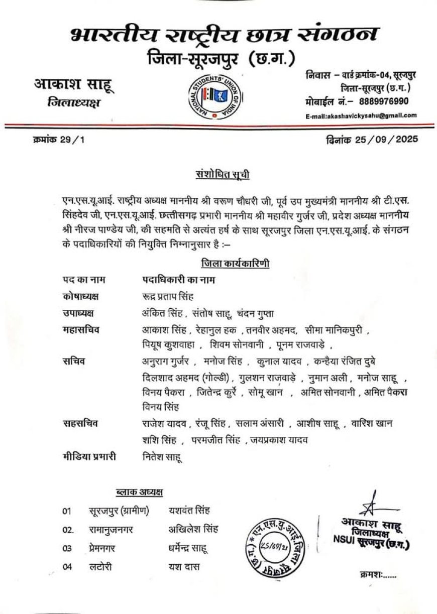 एनएसयूआई सूरजपुर ने की कार्यकारणी की घोषणा, दिलशाद अंसारी (गोल्डी) बने जिला सचिव